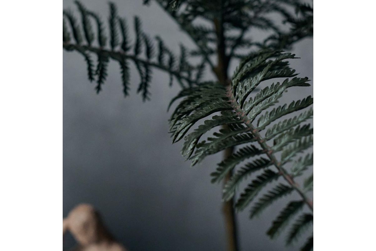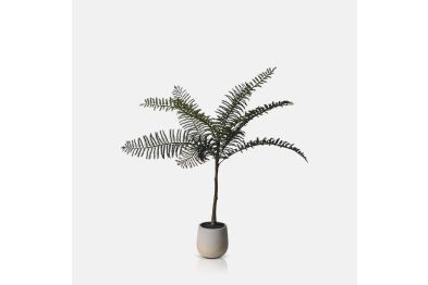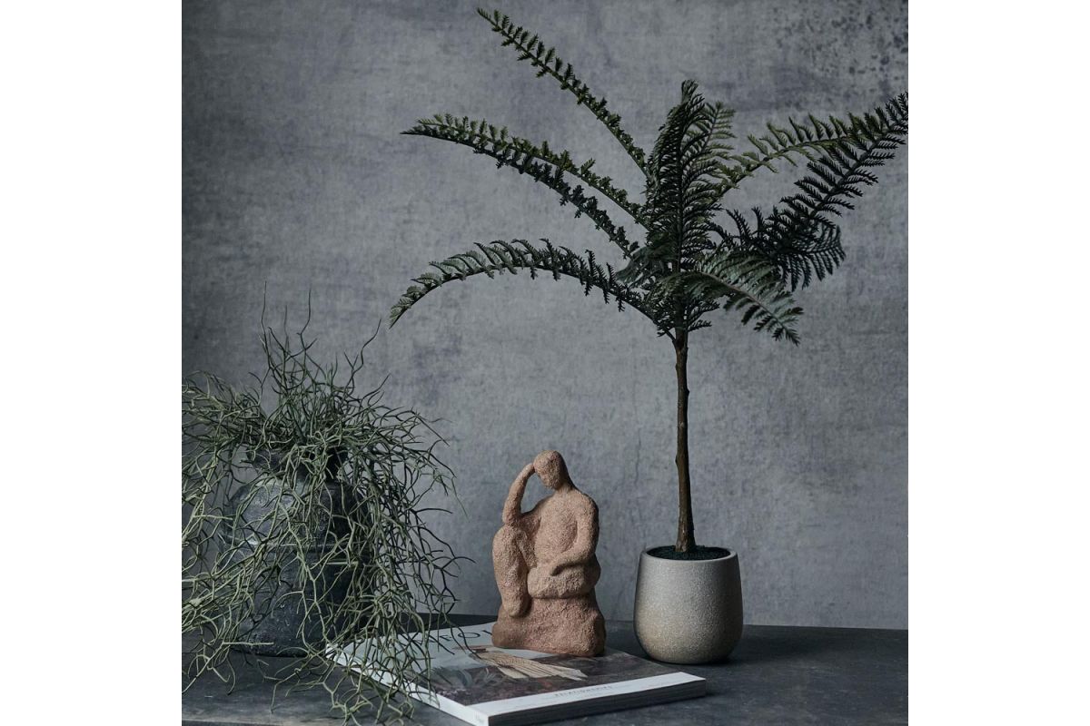 Large faux fern with textural fronds Fuss free, low maintenance Simple and neutral hued pot