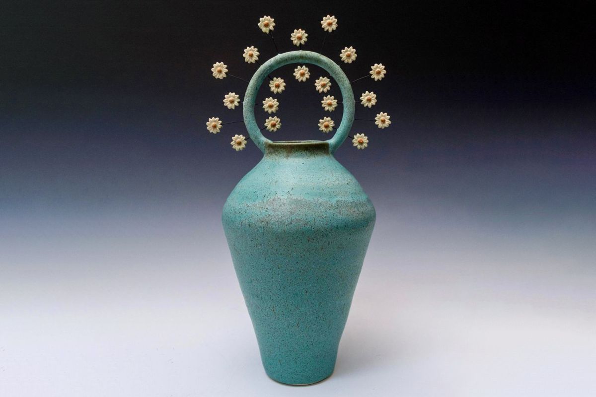 Glazed Stoneware, nichrome wire. Hand-built sculptural vessel. Oxidation firing.