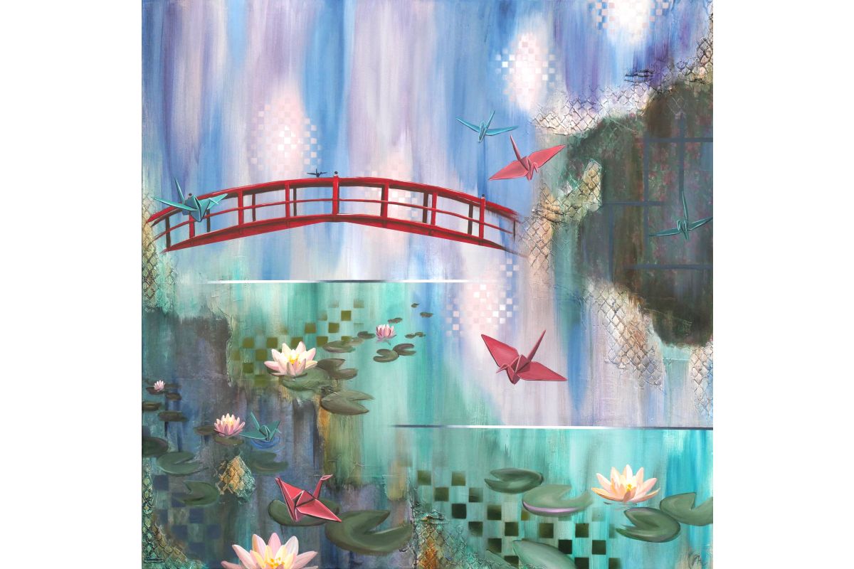 “Support” explores the quiet strength found in community. Origami cranes—symbols of resilience and connection—float through a dreamlike waterscape, where a red bridge hovers above a bed of waterlilies. The bridge, both literal and symbolic, evokes the idea of shared paths and collective strength. Areas of torn-away surface reveal layers of origami paper beneath, suggesting the unseen structures and stories that uphold us. Heavy texture and diamond patterning ground the piece in a tactile presence, creating a balance between fragility and support, solitude and togetherness.